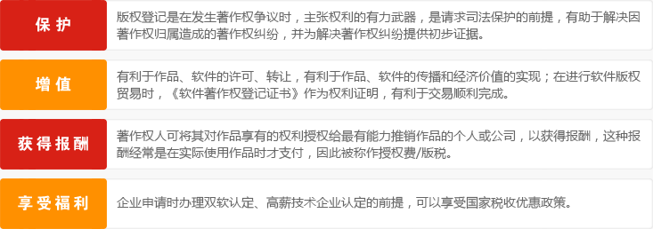 國家著作權行政管理部門鼓勵著作權人進行計算機軟件著作權登記,并對已登記的軟件給予重點保護。軟件著作權登記證書是對登記事項的初步證明,可以幫助持有者在訴訟中祈禱減輕舉證責任的作用。根據國務院頒發的《鼓勵軟件產業和集成電路產業發展的若干政策》的有關規定,證書可以作為軟件企業減免稅收的證明。